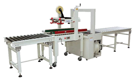 封箱機(紙箱膠帶封口)+高解析噴碼機(日期、批號、廠名等信息噴印打碼設(shè)備)+自動打包機(自動打出兩道PP帶。進(jìn)行紙箱捆扎包裝)