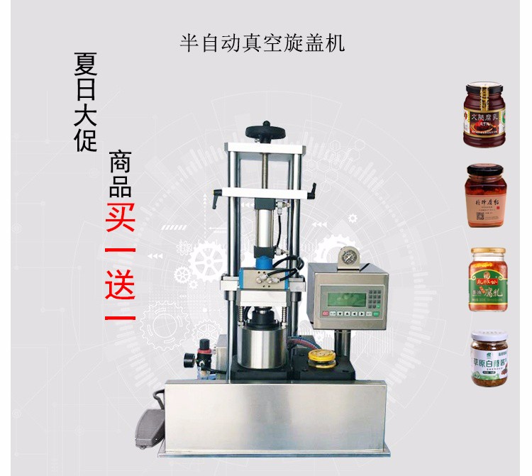 這款小型辣椒醬封口機主要用于食品包裝,采用標準馬口鐵爪式旋開蓋封口的玻璃瓶包裝。可實現的功能是抽吸包裝容器內的空氣使其達到設定的負壓值(即抽真空),然后旋緊蓋子。 為半自動機型,即人工進出瓶,人工配蓋,其他過程自動。