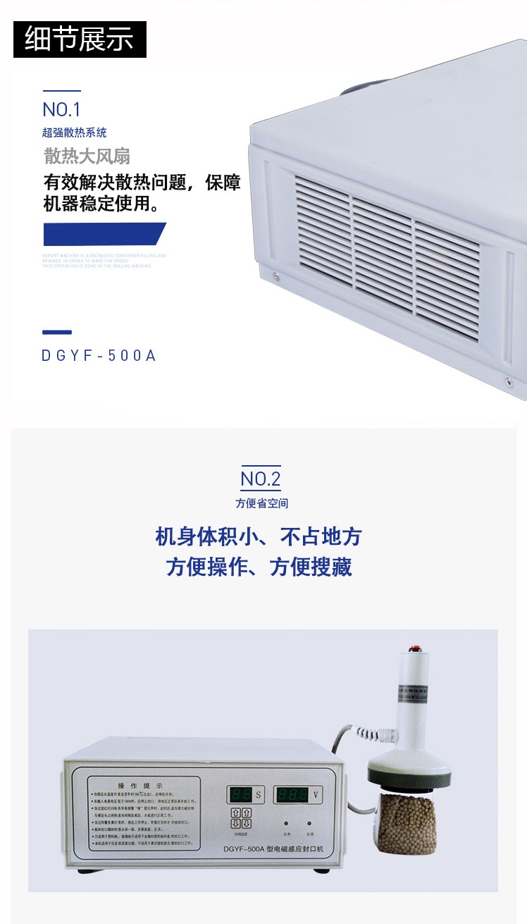本機采用國外先進線路,選用日本新模塊化功率器件,較于一般電子感應加熱器更省電,熱效率達到90%以上,瞬時加熱速度為后者的20-30倍,因此不僅 適用于熱封性能較好的聚乙烯、聚丙烯材質的瓶體,而且對熱封性能較差的聚酯瓶、玻璃瓶也有極好的封口效果。